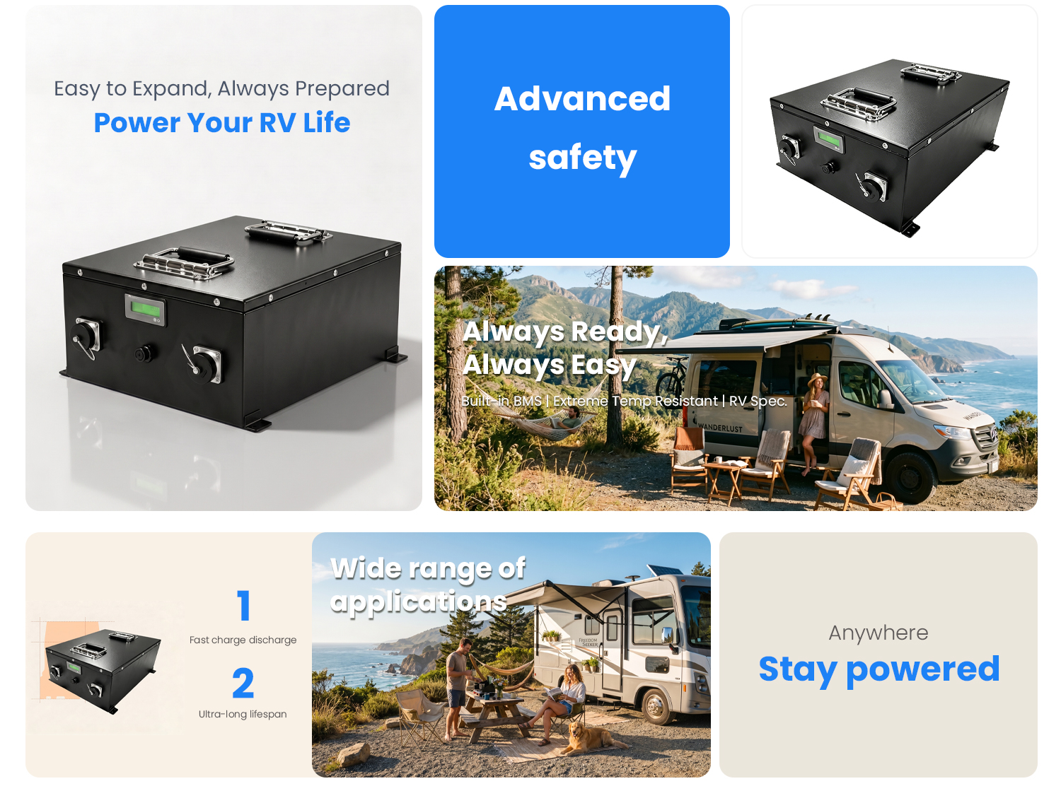 A: The right size depends on your daily energy consumption, inverter power, and how long you want your RV to run without external power. Larger systems usually need higher-capacity 24V battery solutions.
