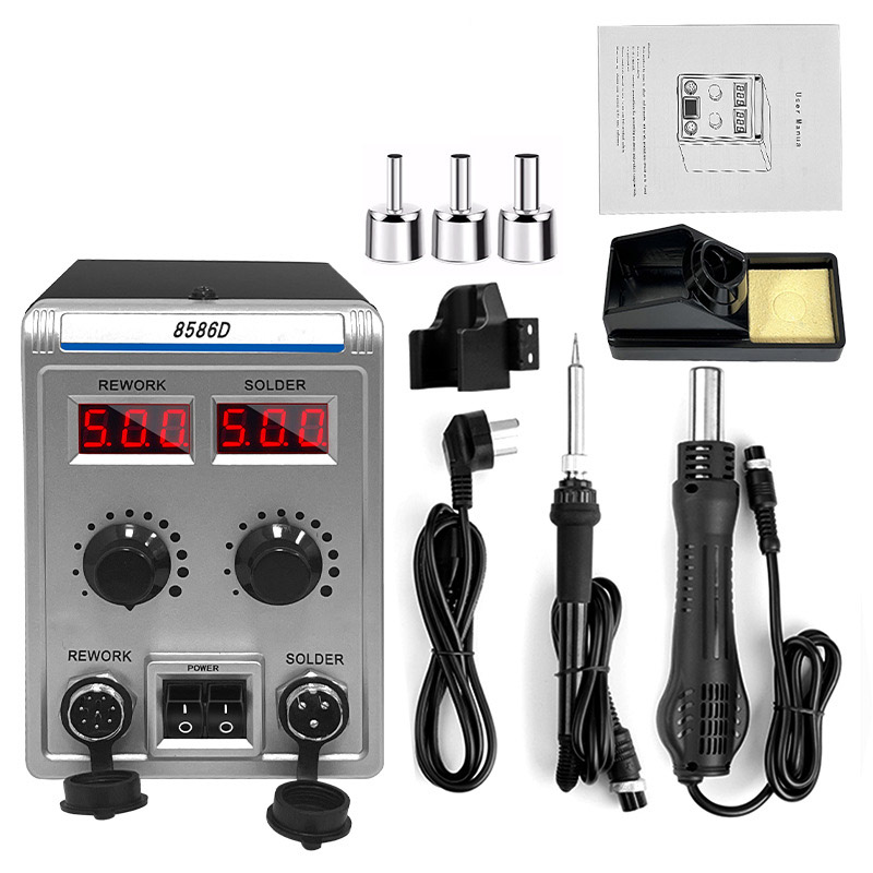 2 in 1 Soldering Station with Hot Air Gun is a multifunctional anti-static desoldering tool combining electric soldering iron + hot air blower. It features digital display, constant temperature control and fast heating, specially designed for mobile phone & computer repair, SMD components desoldering, BGA chip rework and electronic DIY.