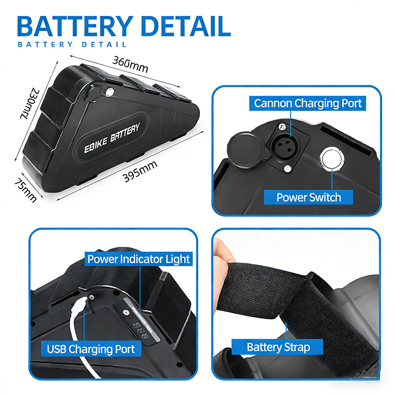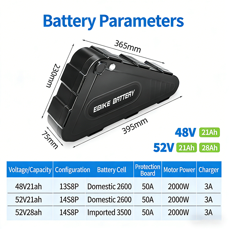 48V 52V 20Ah 28Ah Electric Bicycle Battery is the high-capacity power core for e-bikes, with dual voltage and capacity variants for long commutes, outdoor rides and high-power e-bike use. 48V Electric Bicycle Battery for steady regular riding, 52V Electric Bicycle Battery for stronger high-performance output; 20Ah Electric Bicycle Battery balances endurance and portability, 28Ah Electric Bicycle Battery delivers ultra-long power, each 48V 52V 20Ah 28Ah Electric Bicycle Battery maintains stable voltage for smooth cycling. This 48V 52V 20Ah 28Ah Electric Bicycle Battery uses premium lithium cells for long cycle life and low self-discharge; built-in intelligent BMS protects the 48V 52V 20Ah 28Ah Electric Bicycle Battery from overcharge and short circuit for safe all-road use. Compact, sturdy and easy to mount on most e-bikes, the 48V 52V 20Ah 28Ah Electric Bicycle Battery has waterproof, dustproof and anti-vibration performance, supports fast charging, factory-tested for accurate capacity—your dependable power partner for e-bike riding.