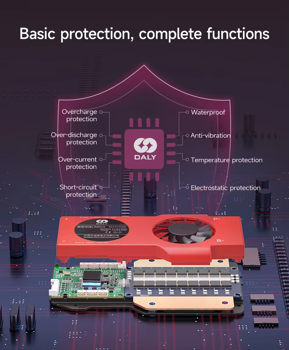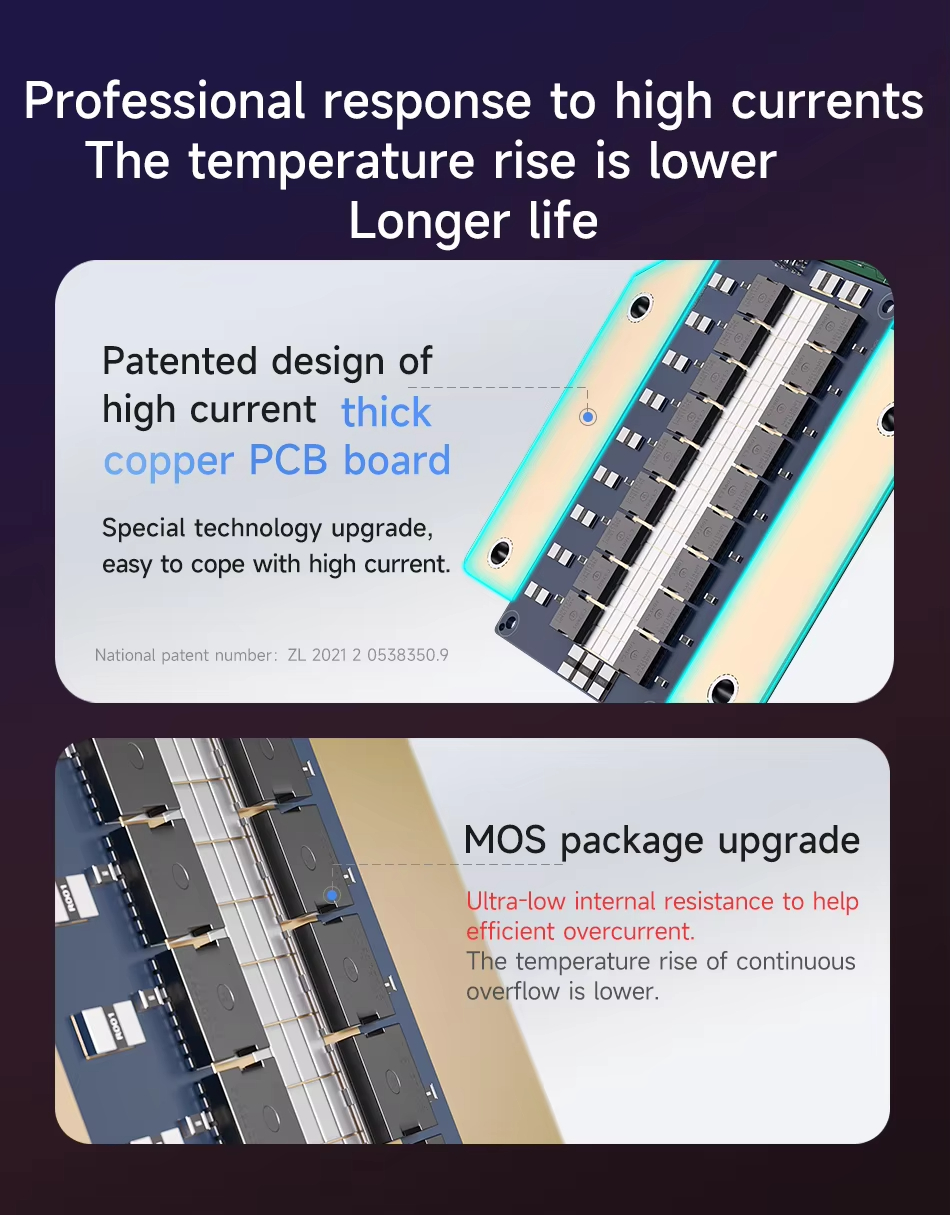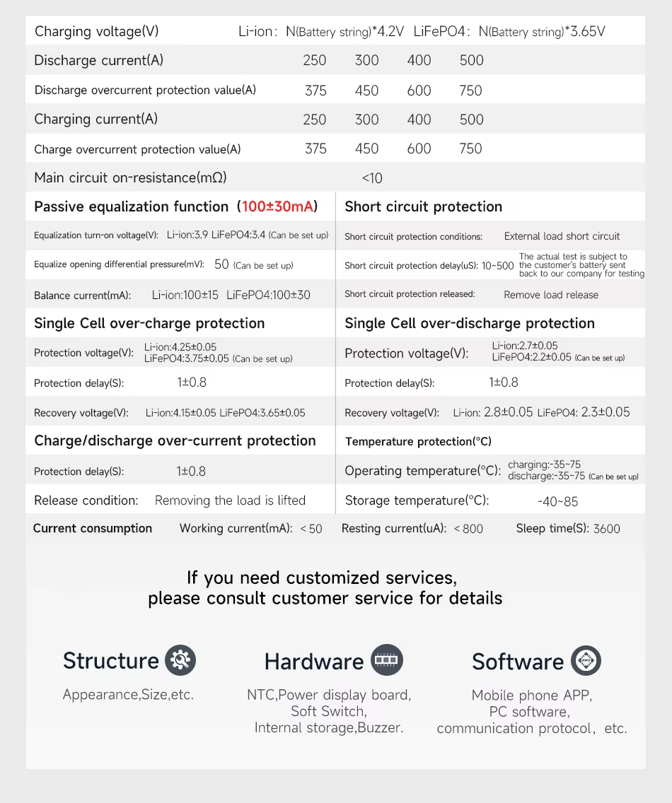 The 4S-24S 12V-72V 250A 300A 400A 500A Smart BMS is a high-power solution for Li-ion, LiFePO4, and LTO battery packs, ideal for golf carts, low-speed EVs, RVs, forklifts, and energy storage systems—your trusted 250A-500A Smart BMS for 4S-24S 12V-72V heavy-duty scenarios.