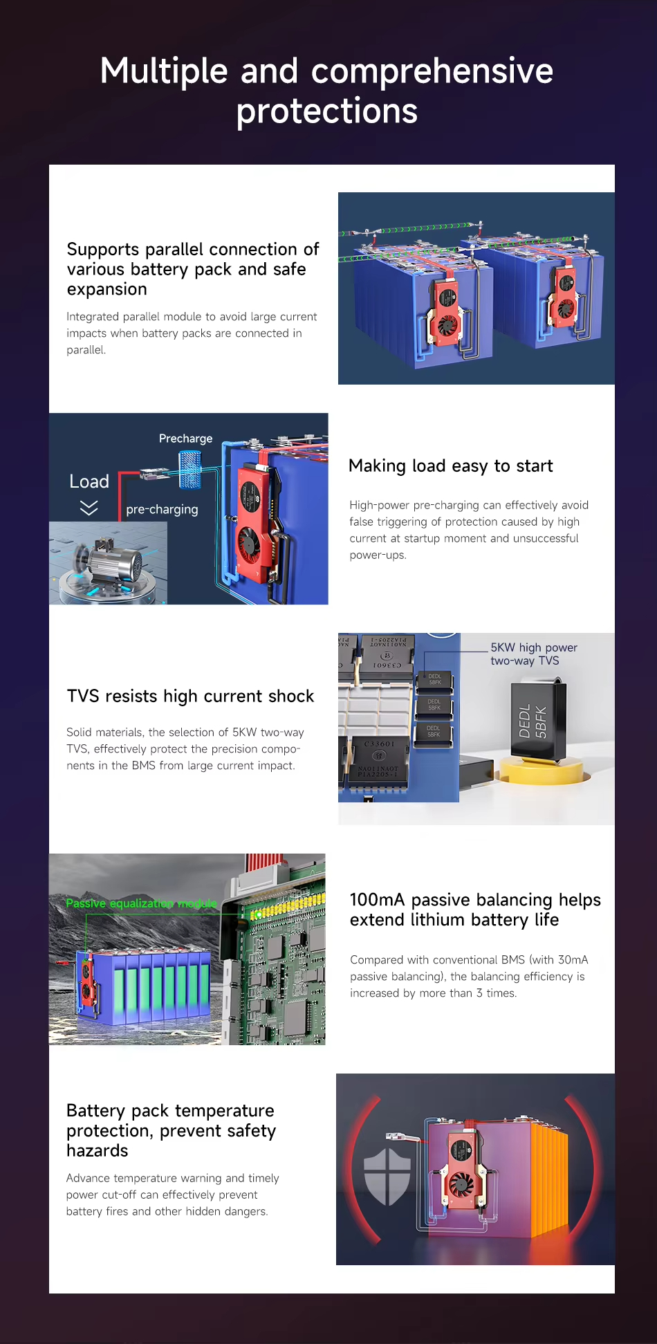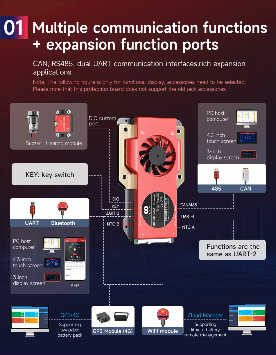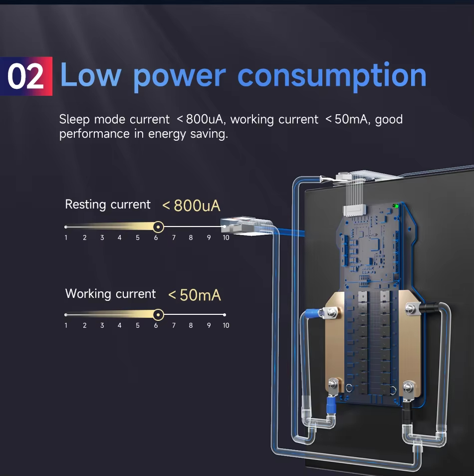 This 12V-72V 4S-24S Smart BMS 250A-500A supports Bluetooth/RS485/CAN/UART communication, enabling APP/PC/cloud monitoring and parameter adjustment. It features passive balancing for cell consistency, plus full protection (overcharge, over-discharge, short-circuit, temperature, electrostatic) and 4 NTC sensors for stable operation.