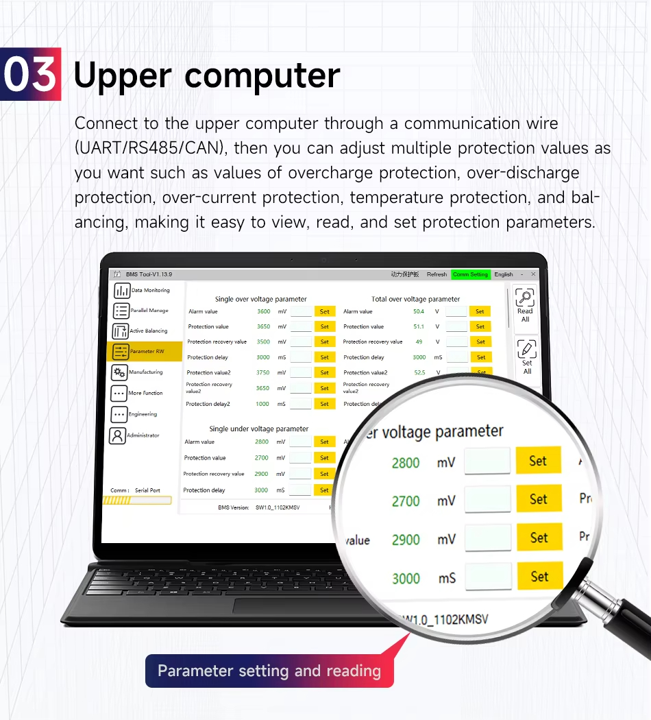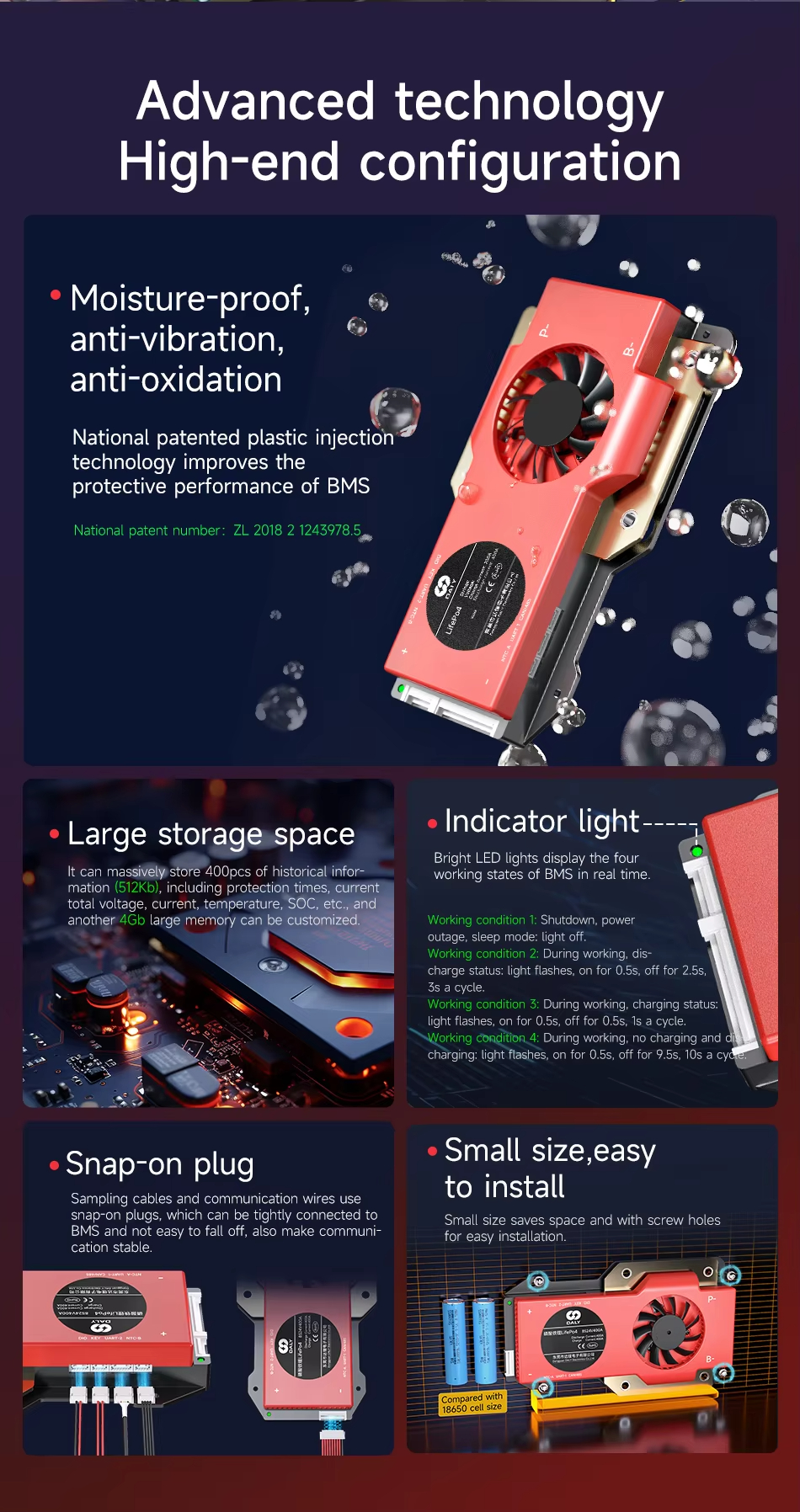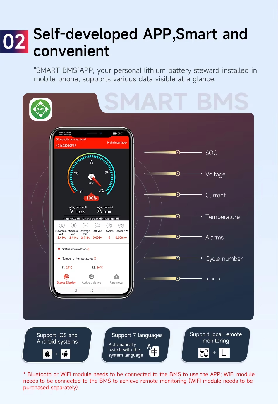 This 12V-72V 4S-24S Smart BMS 250A-500A supports Bluetooth/RS485/CAN/UART communication, enabling APP/PC/cloud monitoring and parameter adjustment. It features passive balancing for cell consistency, plus full protection (overcharge, over-discharge, short-circuit, temperature, electrostatic) and 4 NTC sensors for stable operation.